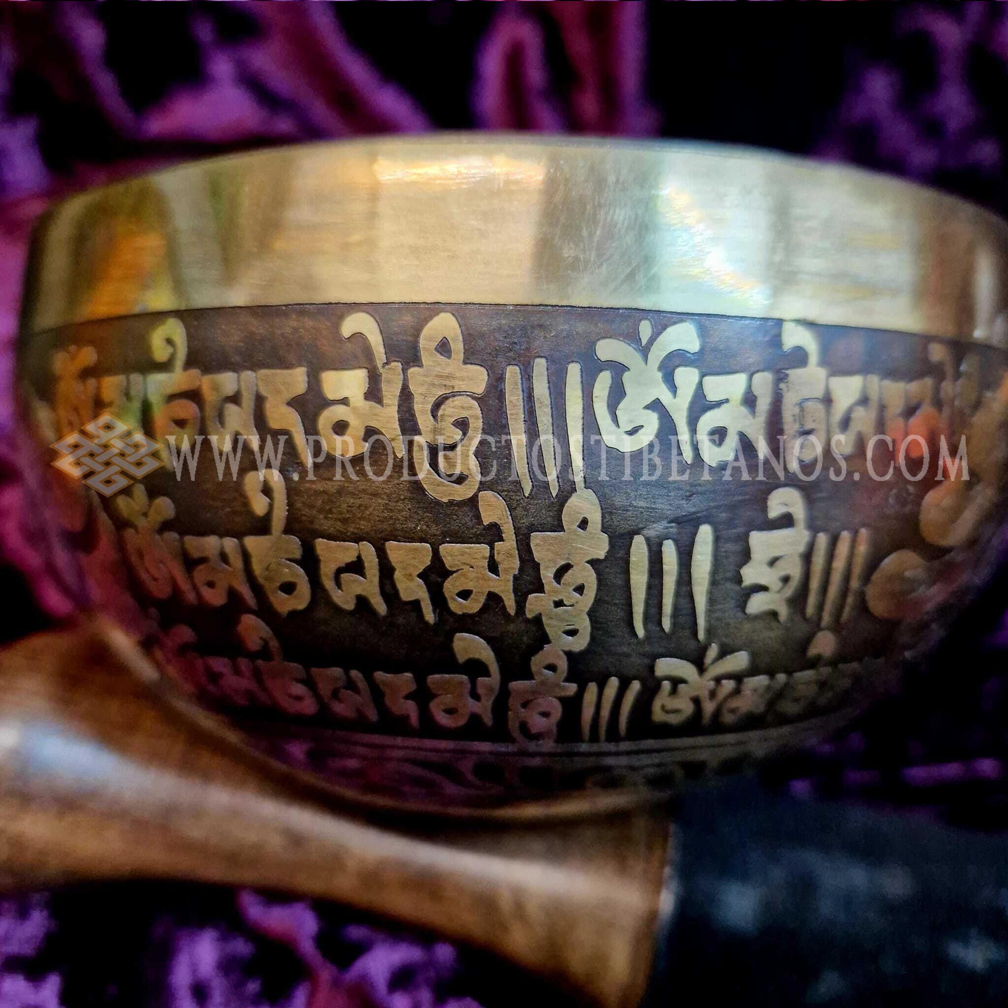 Cuenco hecho a mano envejecido y grabado a mano con motivos de la simbología tradicional tibetana y también con matras tibetanos, generalmente OM MANI PEDME AUM. Los cuencos Grabados a mano son mas gruesos de pared en el mismo tamaño de diámetro que el resto, Jam y Golden, por lo que su sonido es mas puro, mas vibrante y por lo tanto mas duradero que los otros. Poseen un sonido que perdura por largo tiempo expandiéndose por todo el ambiente, cambiando la vibración de su entorno. Se utilizan cada vez más con fines terapéuticos. Incluyen la baqueta para tocarlos.