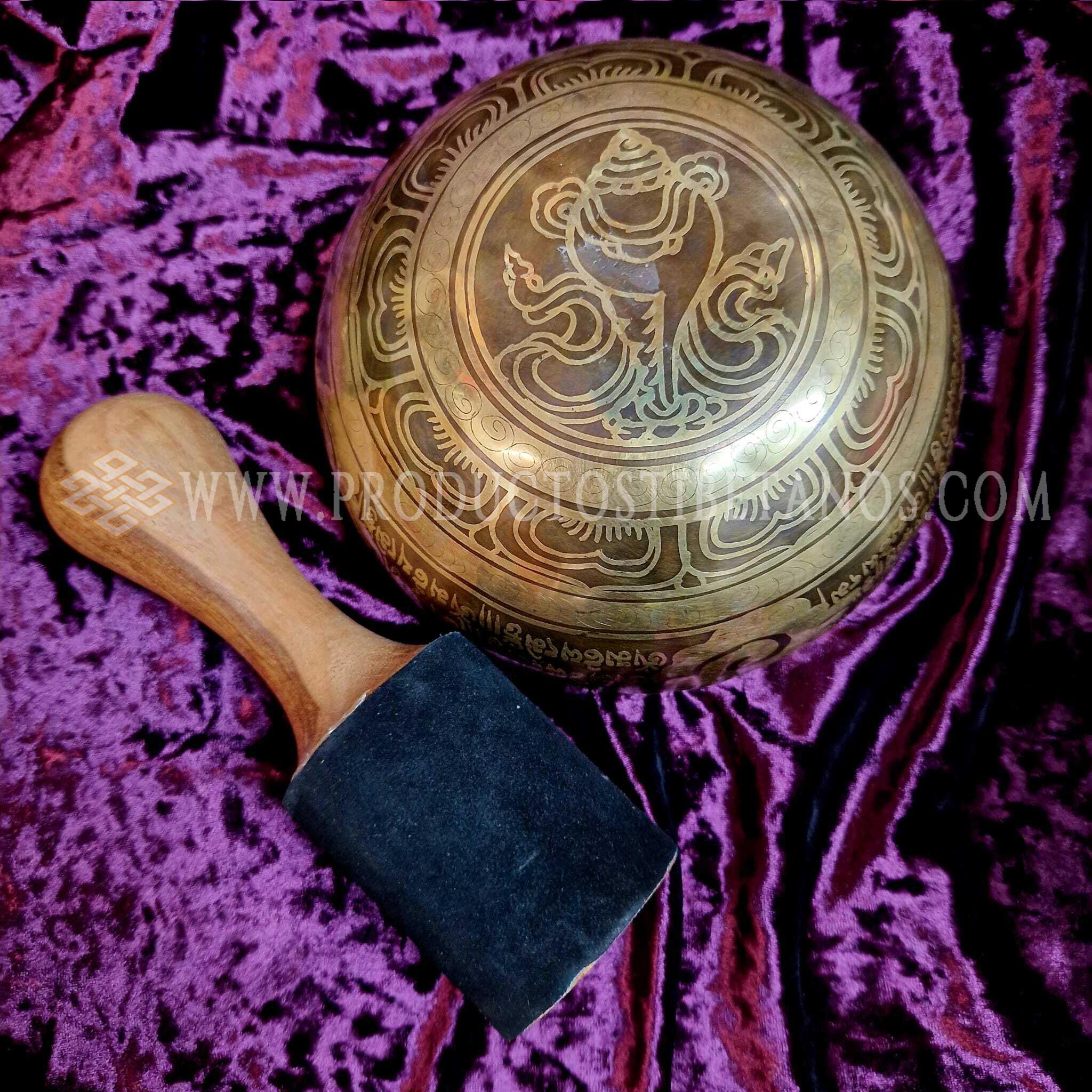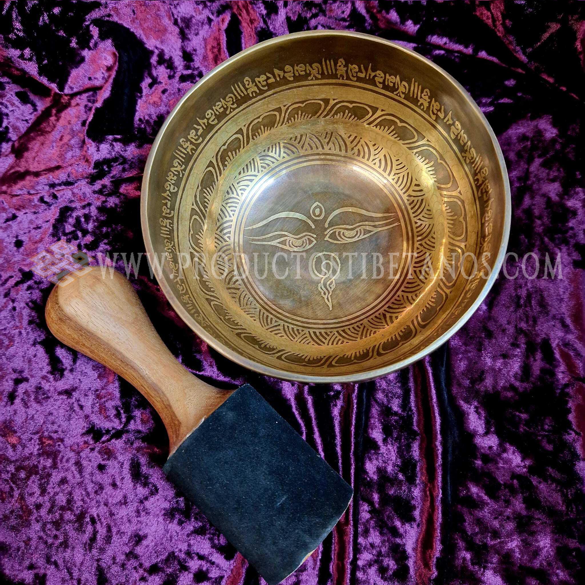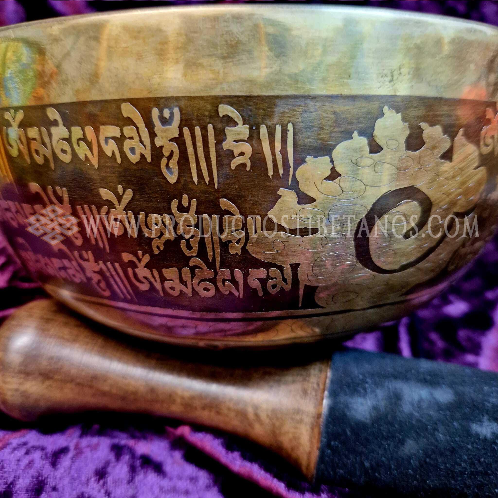 Cuenco hecho a mano envejecido y grabado a mano con motivos de la simbología tradicional tibetana y también con matras tibetanos, generalmente OM MANI PEDME AUM. Los cuencos Grabados a mano son mas gruesos de pared en el mismo tamaño de diámetro que el resto, Jam y Golden, por lo que su sonido es mas puro, mas vibrante y por lo tanto mas duradero que los otros. Poseen un sonido que perdura por largo tiempo expandiéndose por todo el ambiente, cambiando la vibración de su entorno. Se utilizan cada vez más con fines terapéuticos. Incluyen la baqueta para tocarlos.